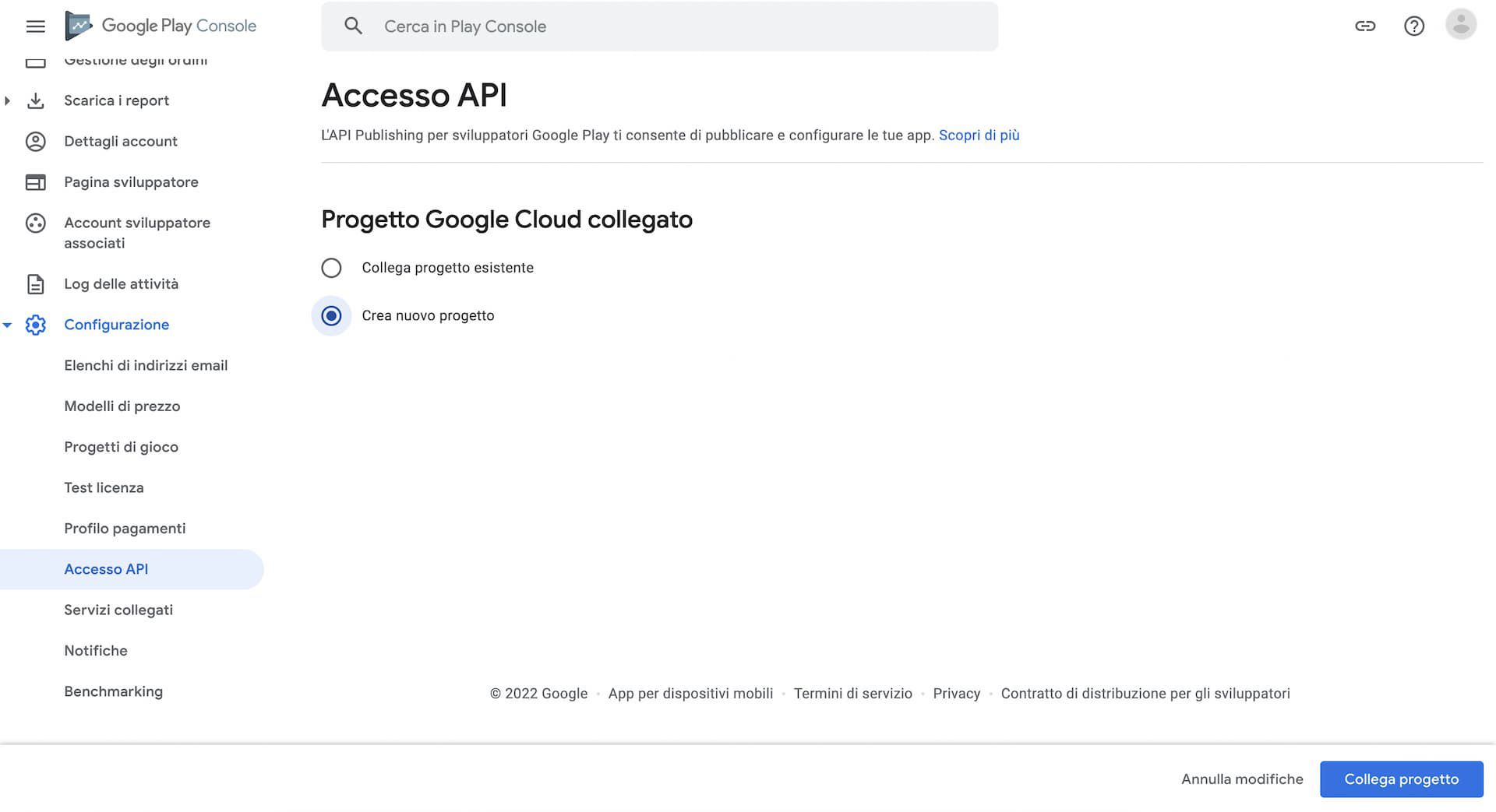 Dal menu di sinistra selezione API Access ed effettuare un link ad un Google Cloud project, consiglio di creare un nuovo progetto dedicato.
