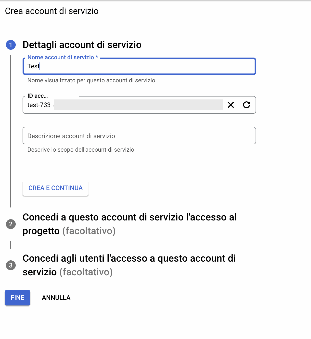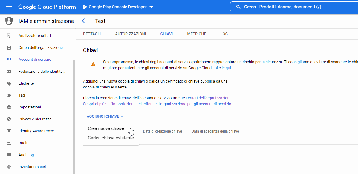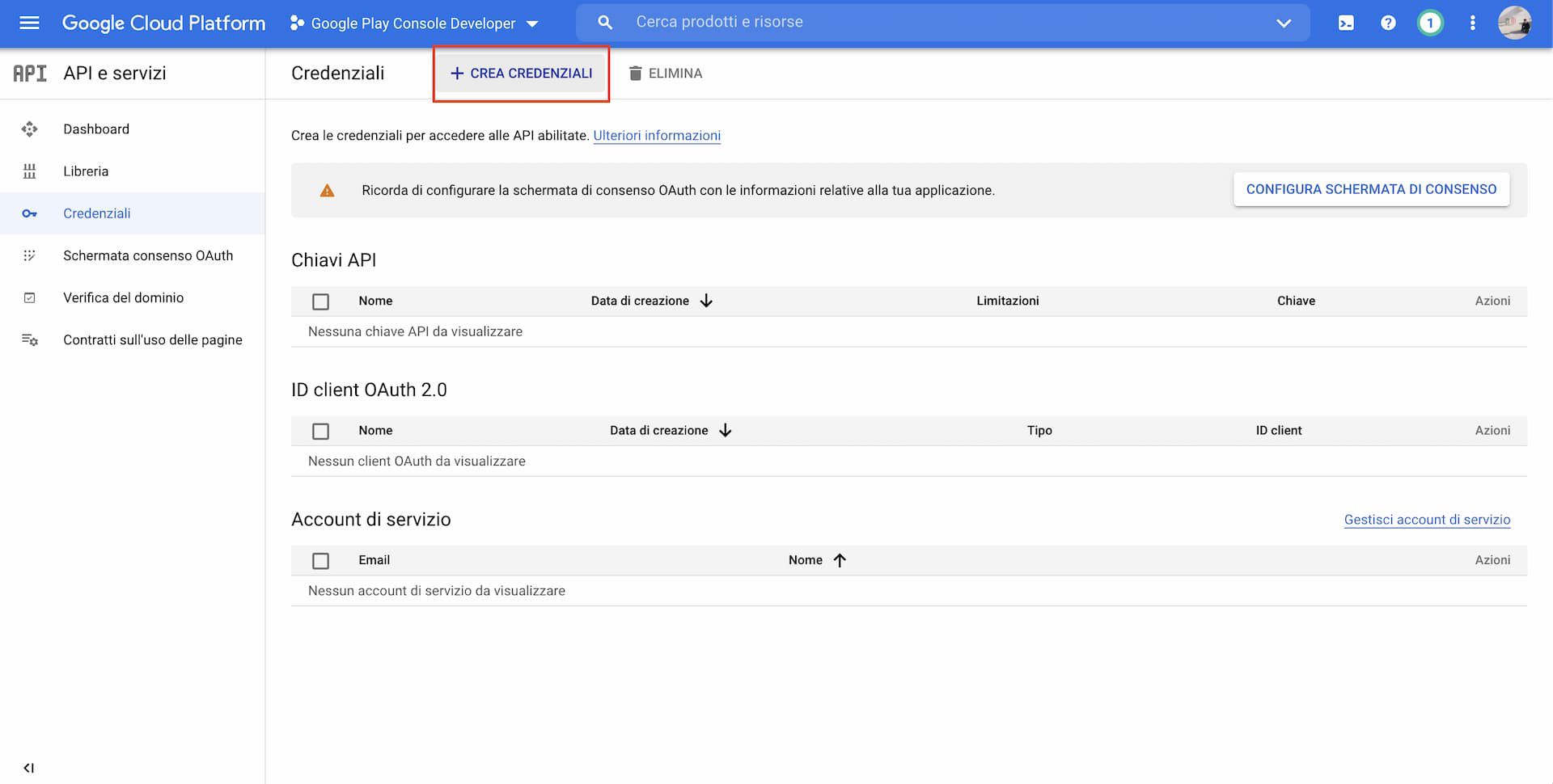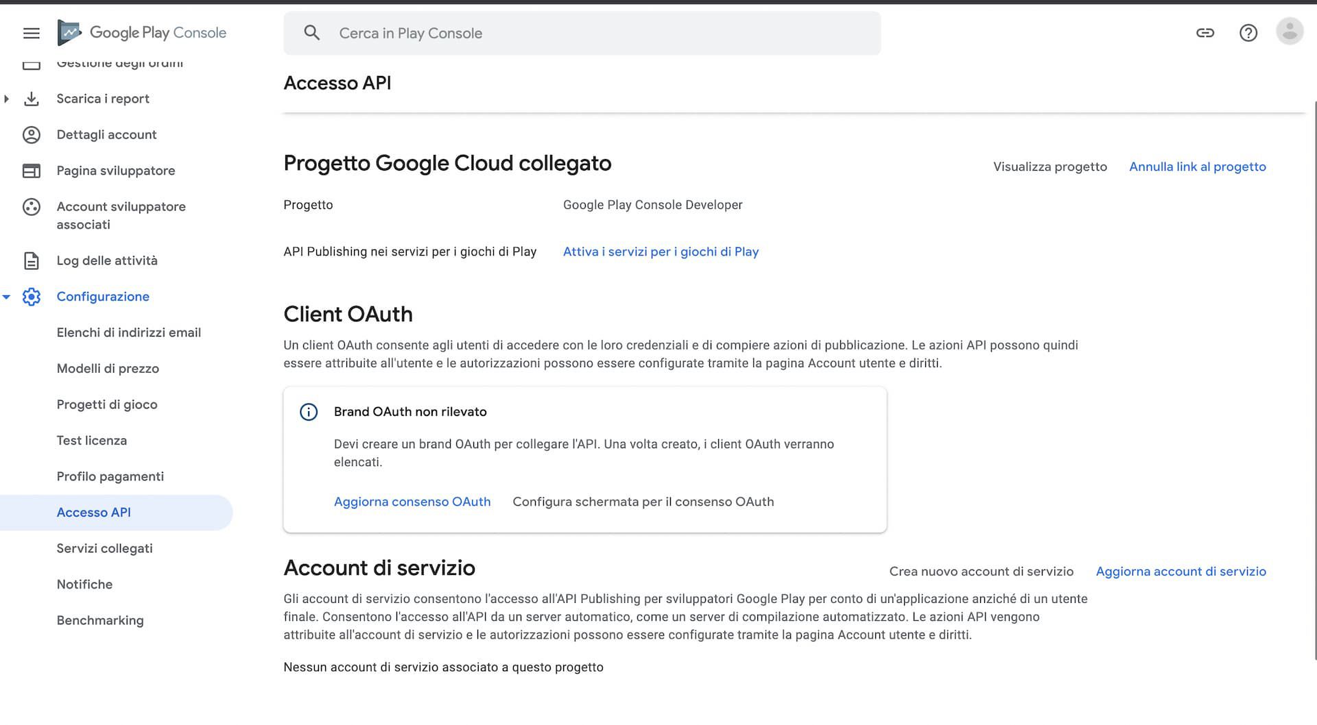 - Una volta creato il progetto si può notare la presenza della sezione Account di servizio, a questa dobbiamo collegare un account che sarà appunto quello necessario per interrogare la Play Console