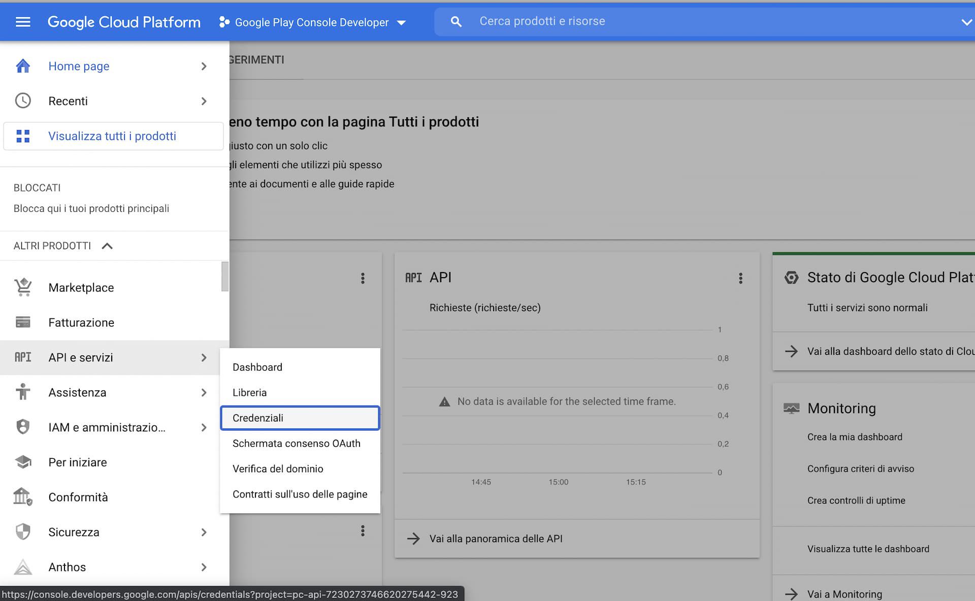Dalla Google Cloud Platform è necessario andare su Api e Servizi -> Credenziali