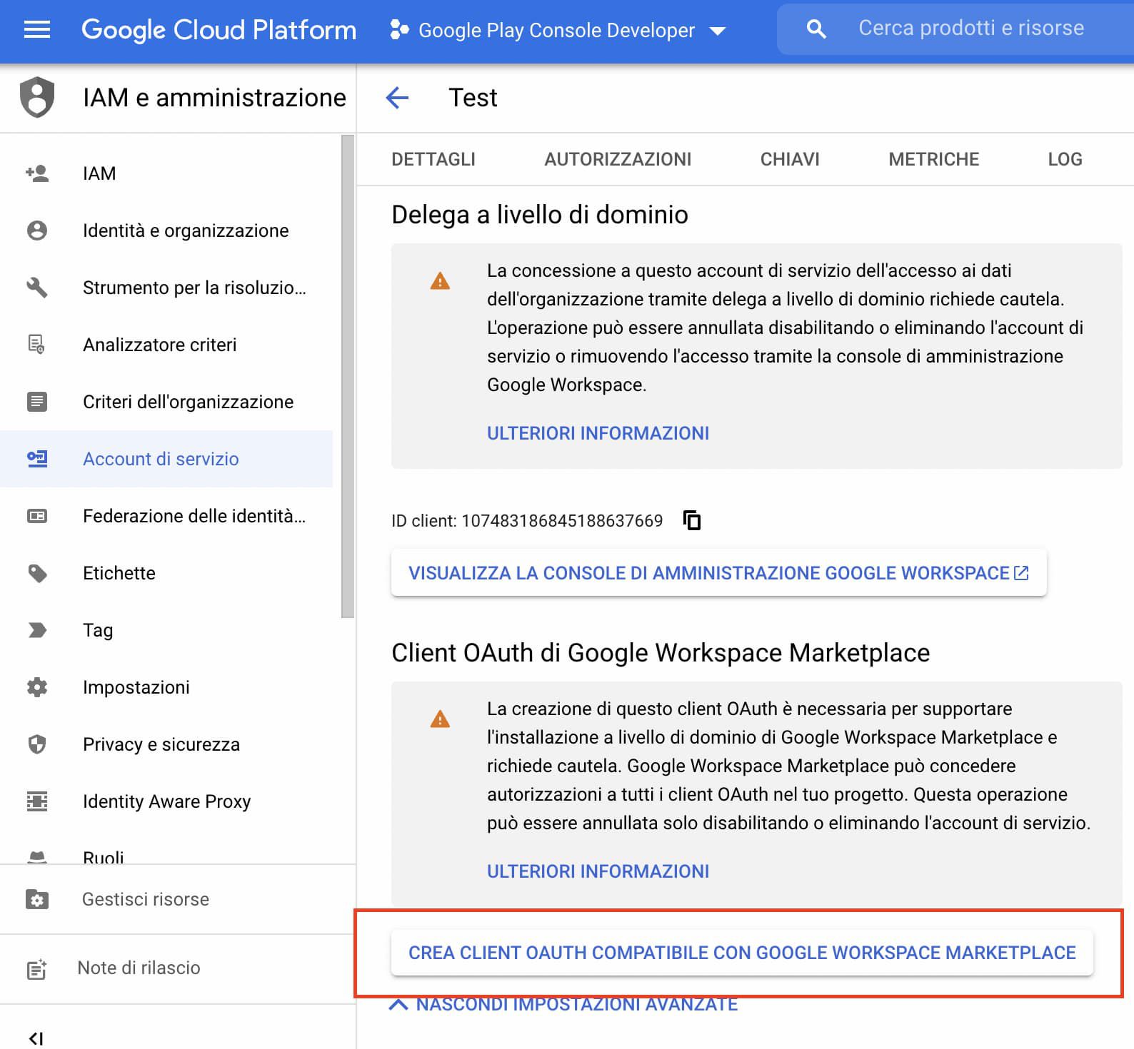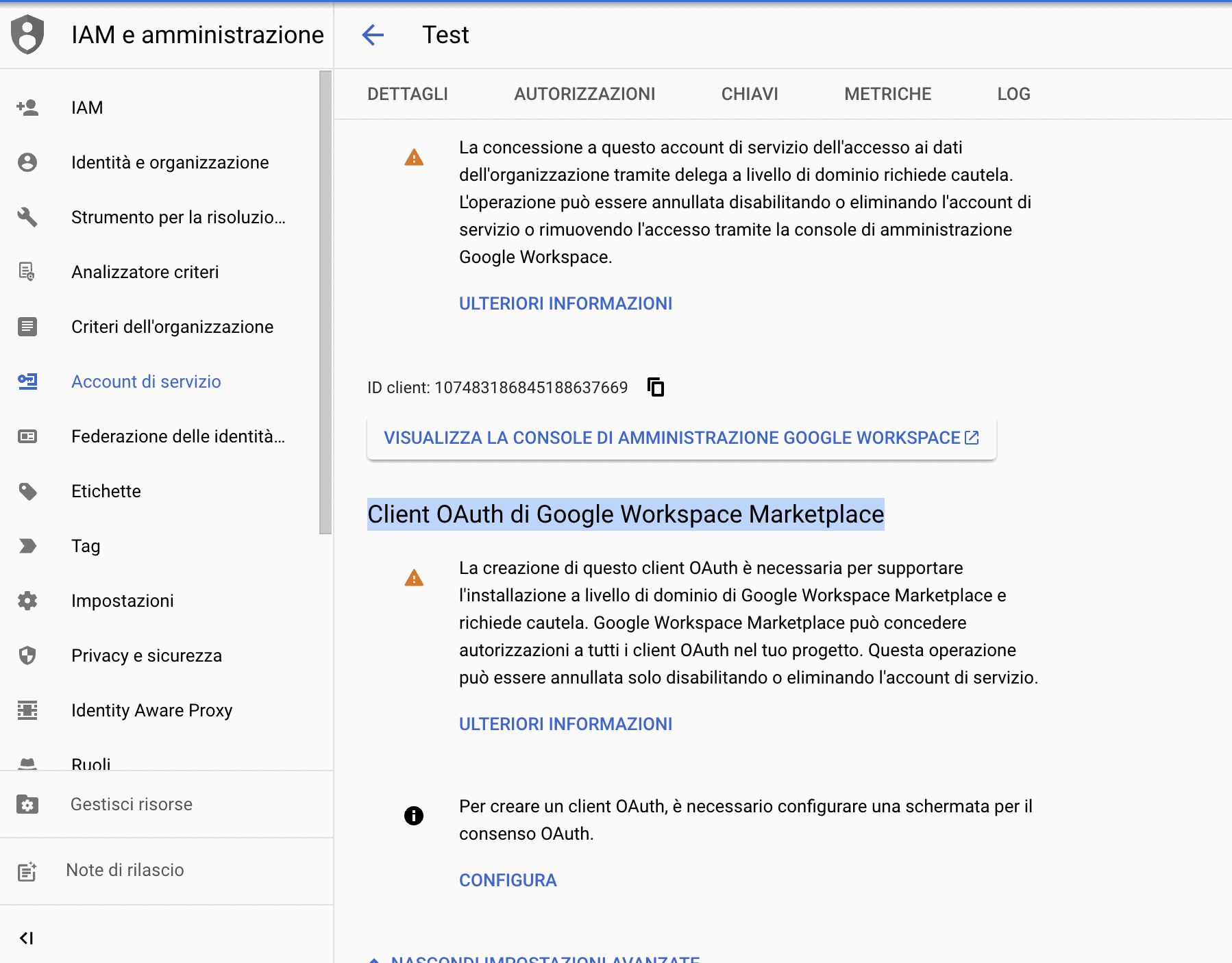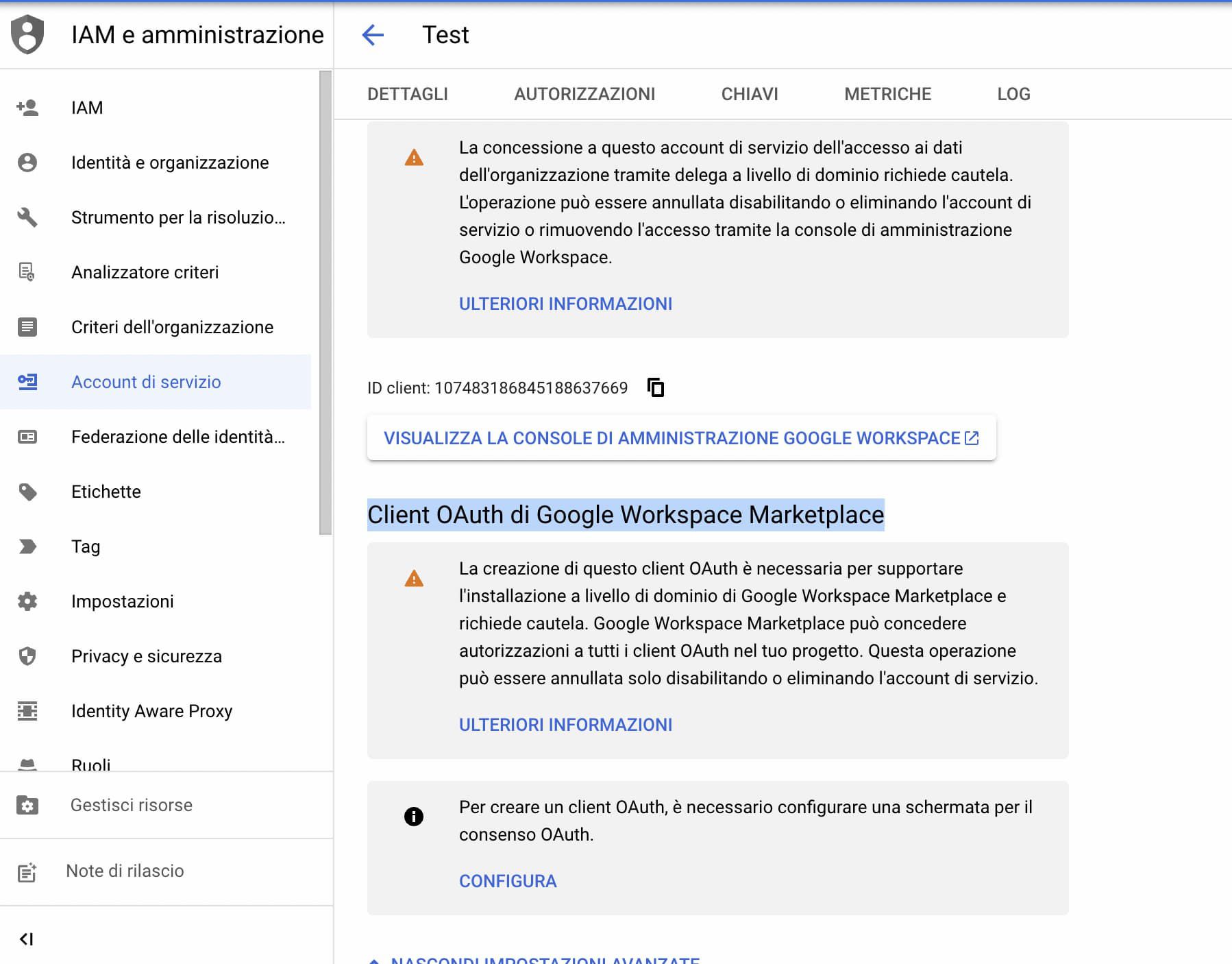 - Creato l'account verremo riportati alla schermata precedente, anche se, creato l'account ancora non è completamente configurato per poter essere utilizzato, infatti dobbiamo richiedere l'autorizzazione per Client OAuth di Google Workspace Marketplace.