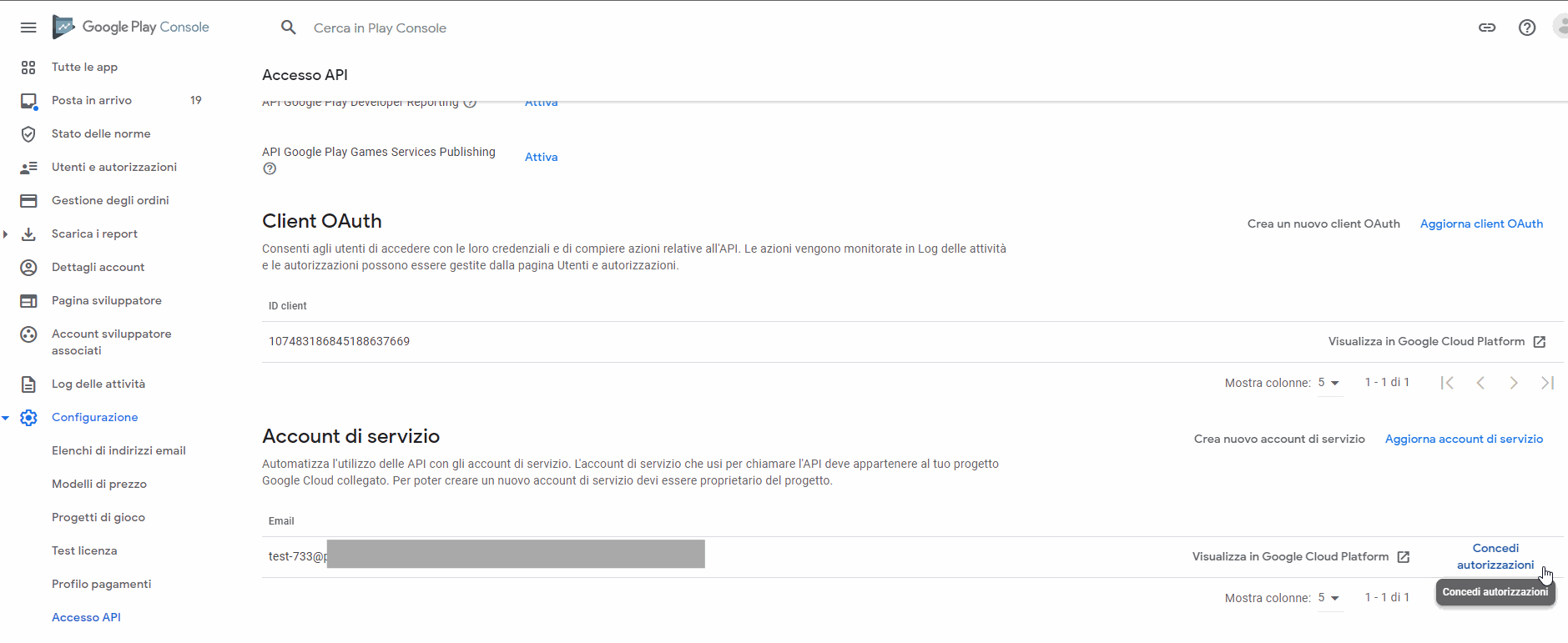 14. Adesso che abbiamo un Account di Servizio configurato dobbiamo ritornare alla Google Play Console nella sezione e condividere le dovute autorizzazioni all'account.