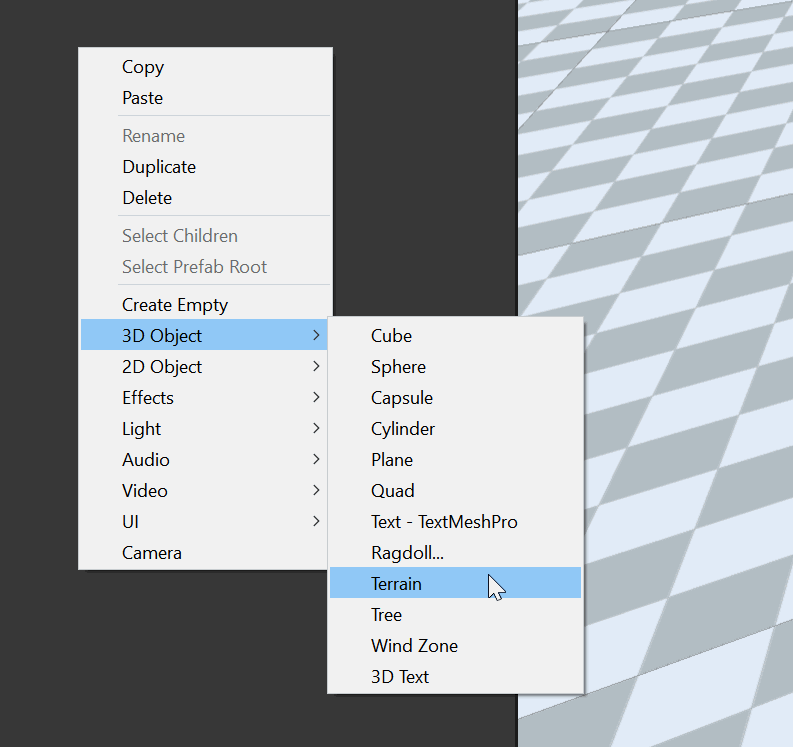 - Sulla sinistra dentro Hierarchy cliccare con il tasto destro del mouse e dal menu selezionare 3D Object->Terrain