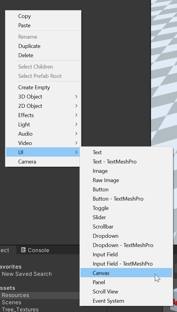 2. Aggiungere con oggetto figlio una Raw Image: per farlo cliccare sul Canvas appena creato quindi premere tasto destro e andare su UI->Raw Image.