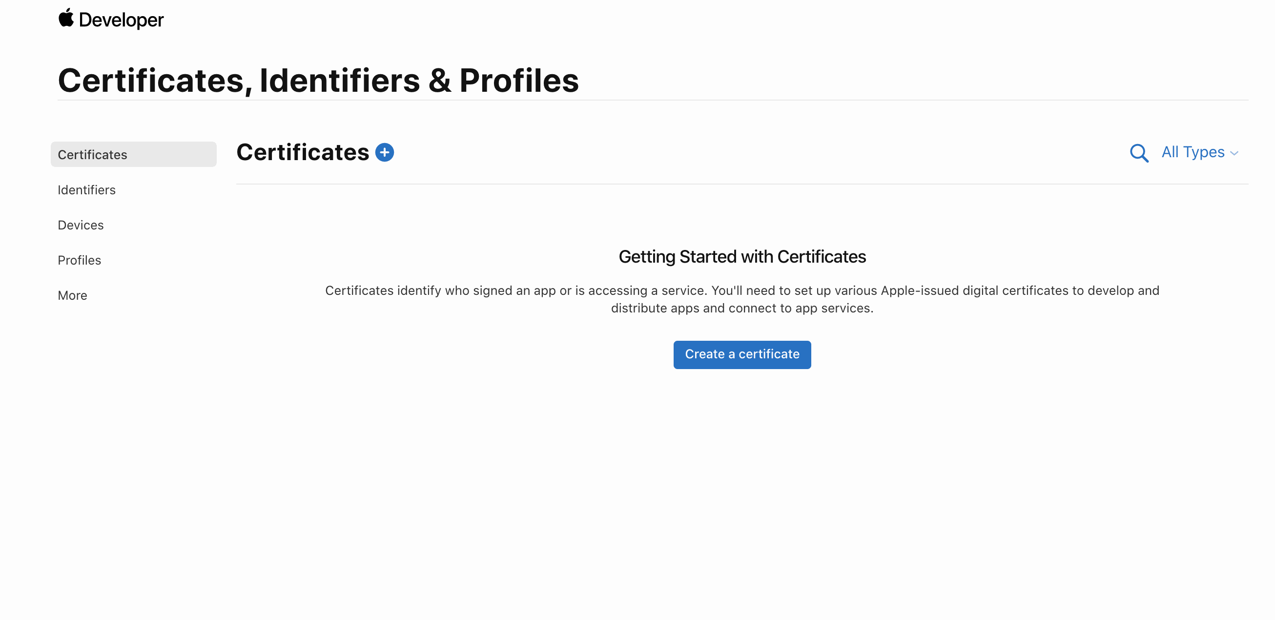 1. Accedi all'Apple Developer Portale fai clic su Certificati, Identificatori e Profili