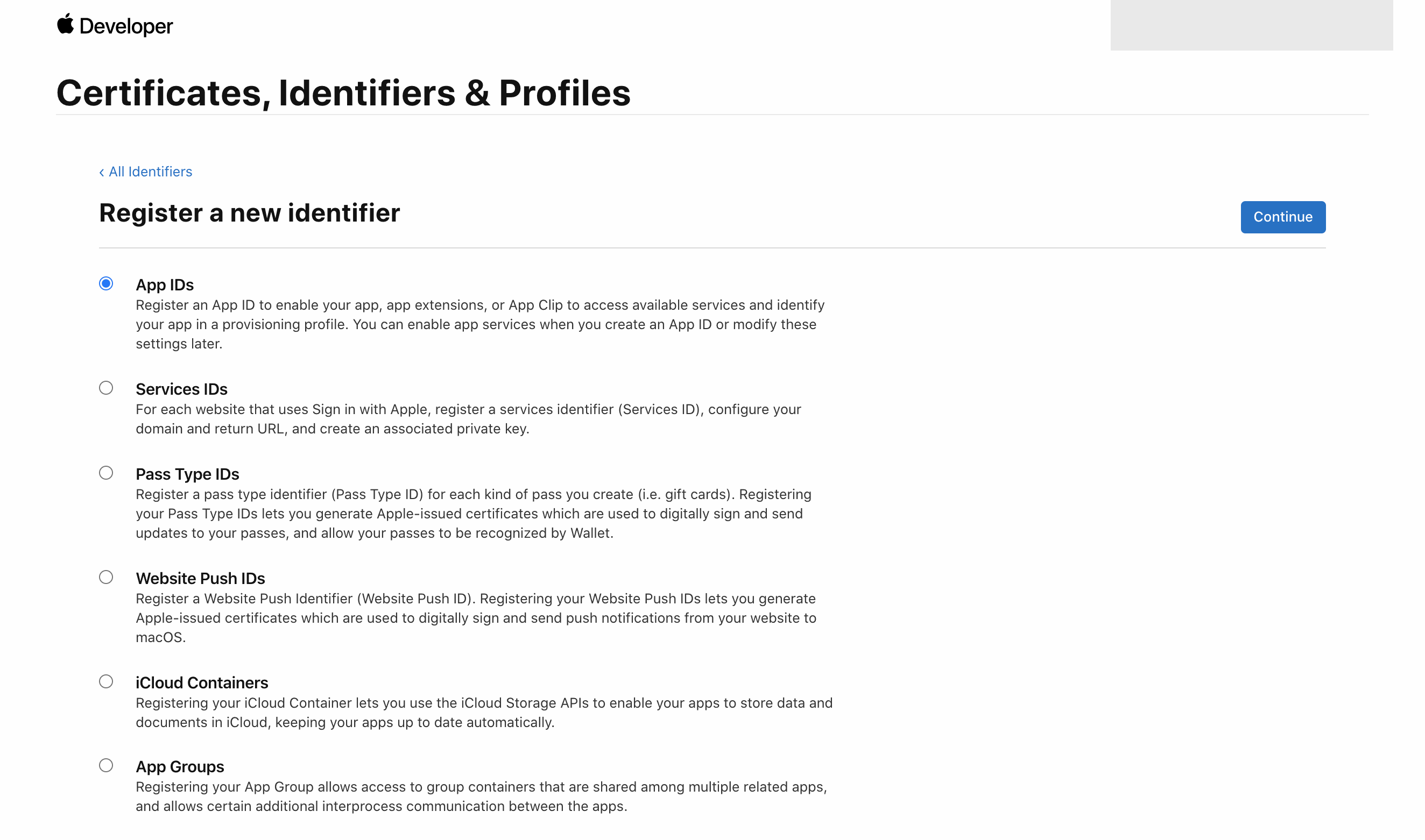 2. Crea l'App ID Dalla barra laterale, scegli Identificatori, quindi fai clic sul "più" di colore blu poi seleziona App ID