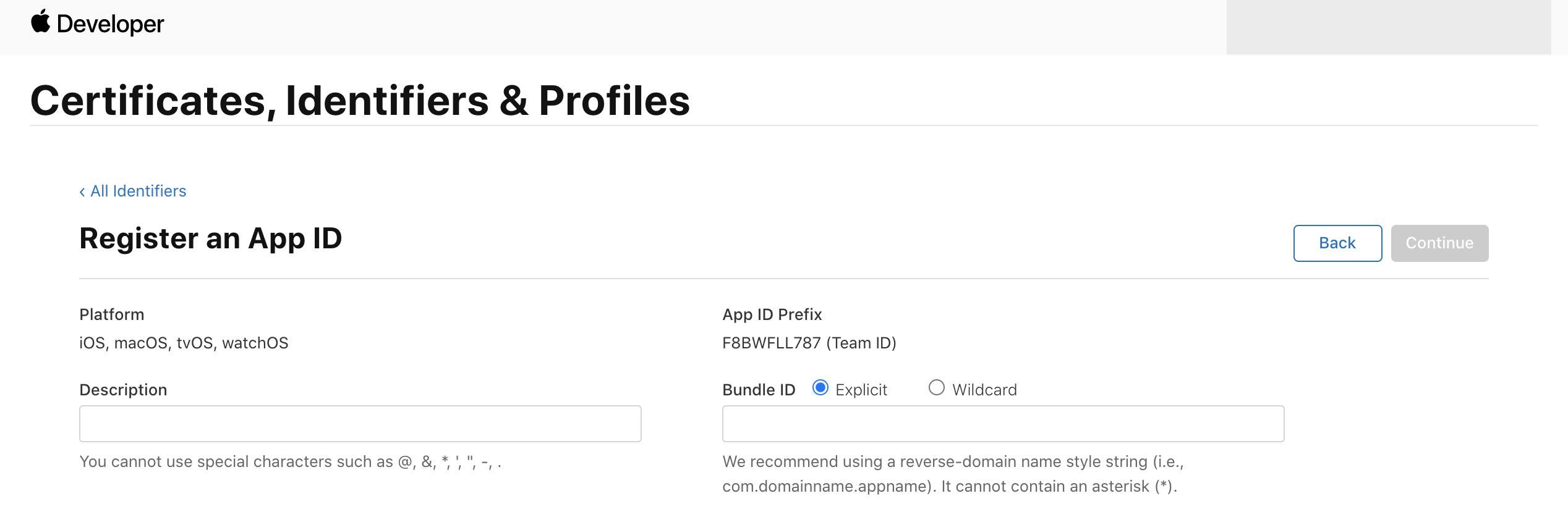 Nella schermata successiva scegli la descrizione e un ID bundle per l'ID app. La descrizione non è troppo importante, ma digita qualcosa di descrittivo. L'ID bundle è generalmente creato in stile DNS inverso (it.example.app)