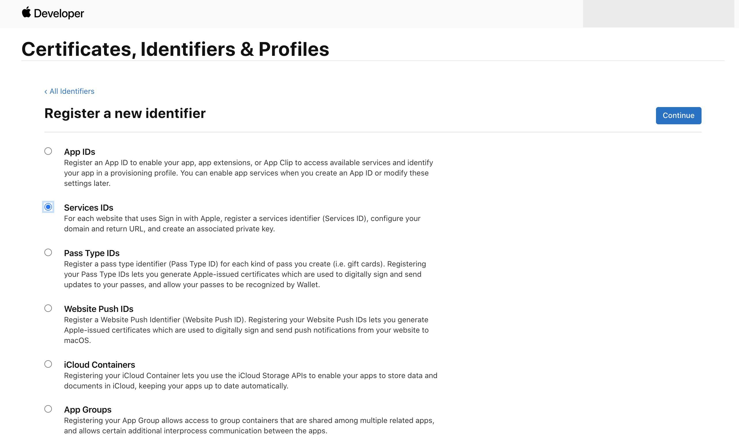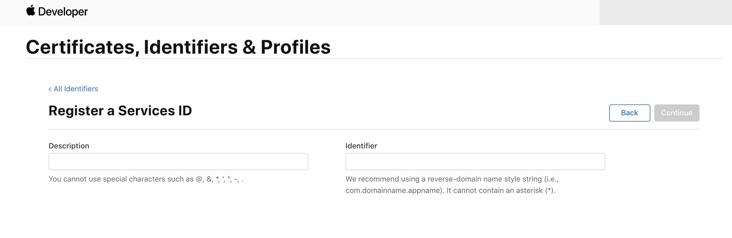 Nel passaggio successivo, definirai il nome dell'app che l'utente vedrà durante il flusso di accesso, oltre a definire l'identificatore che diventa OAuth client_id. Assicurati di selezionare anche la casella di controllo login Apple.