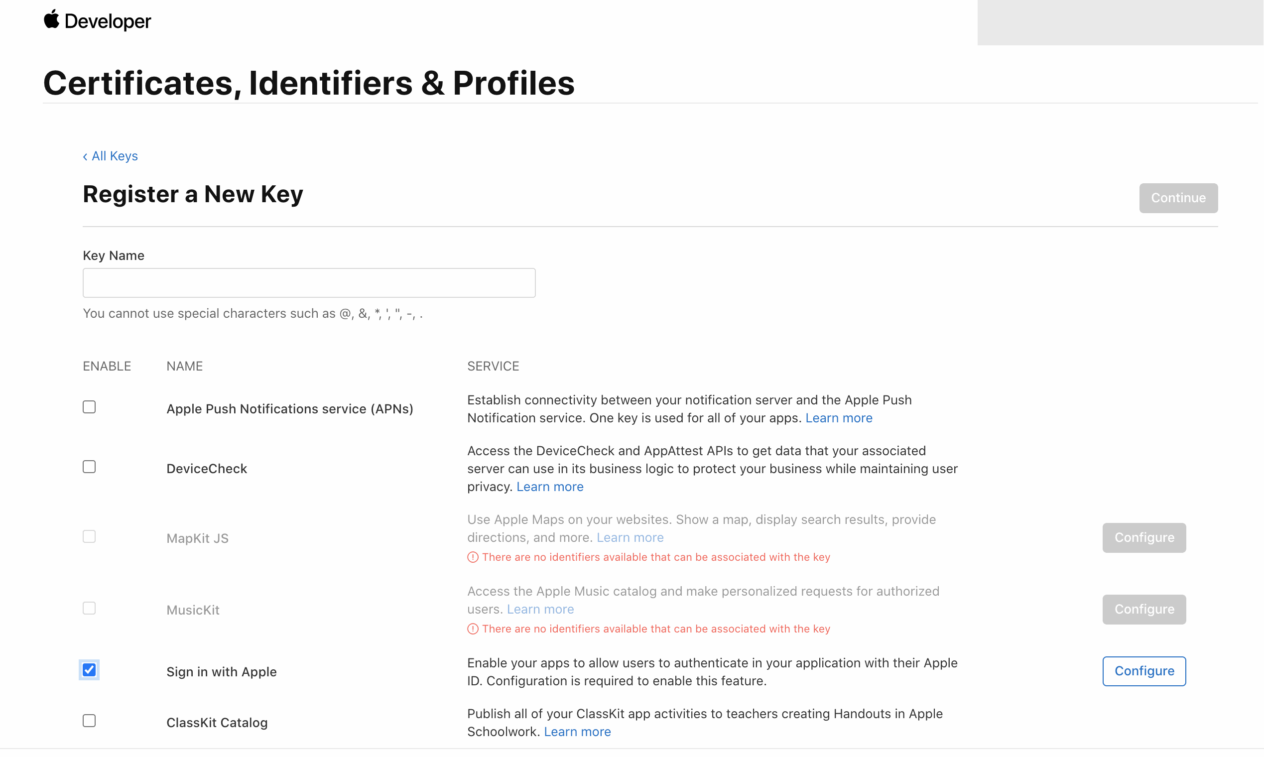 Registra una nuova chiave e assegnagli un nome poi seleziona la casella di login con Apple