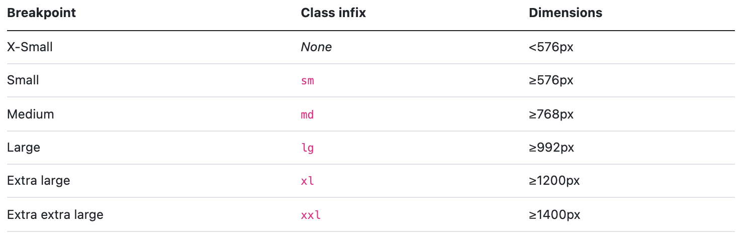 Breakpoints definiscono delle soglie di comportamento del componente HTML che le usa in base alla larghezza del viewport: in questo modo è possibile definire delle regole differenti per i vari devices su cui verrà visualizzata l'applicazione. Di seguito la definizione di default dei breakpoints (possono essere sovrascritte):Come vedremo fra poco, queste variabili vengono utilizzate in combinazione ad altre classi CSS per fare riferimento a quella specifica soglia. Per fare un esempio con la misura xs è come dire al componente:
