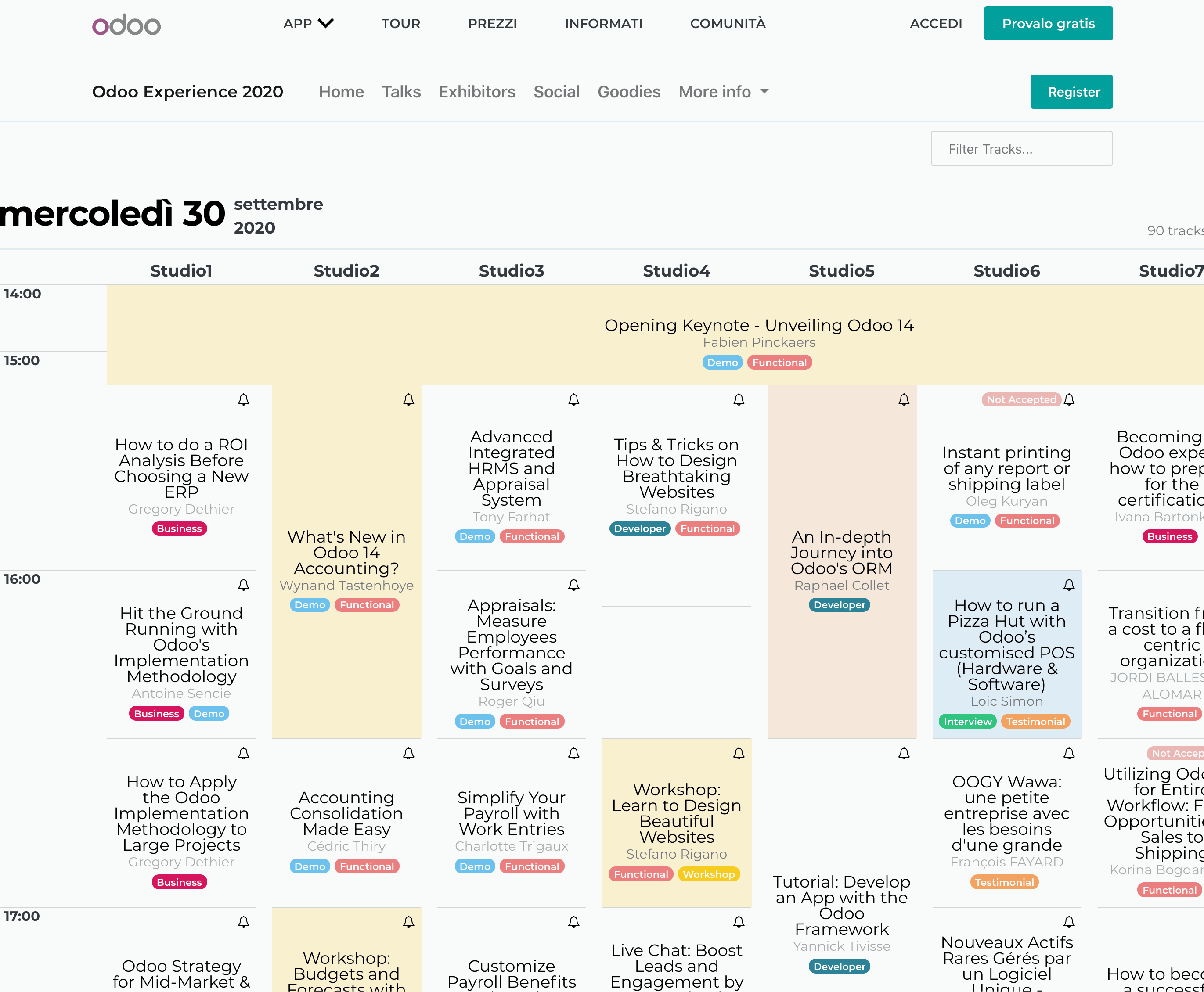 https://www.odoo.com/it_IT/event/odoo-experience-2020-2020-09-30-2020-10-01-2622/agenda