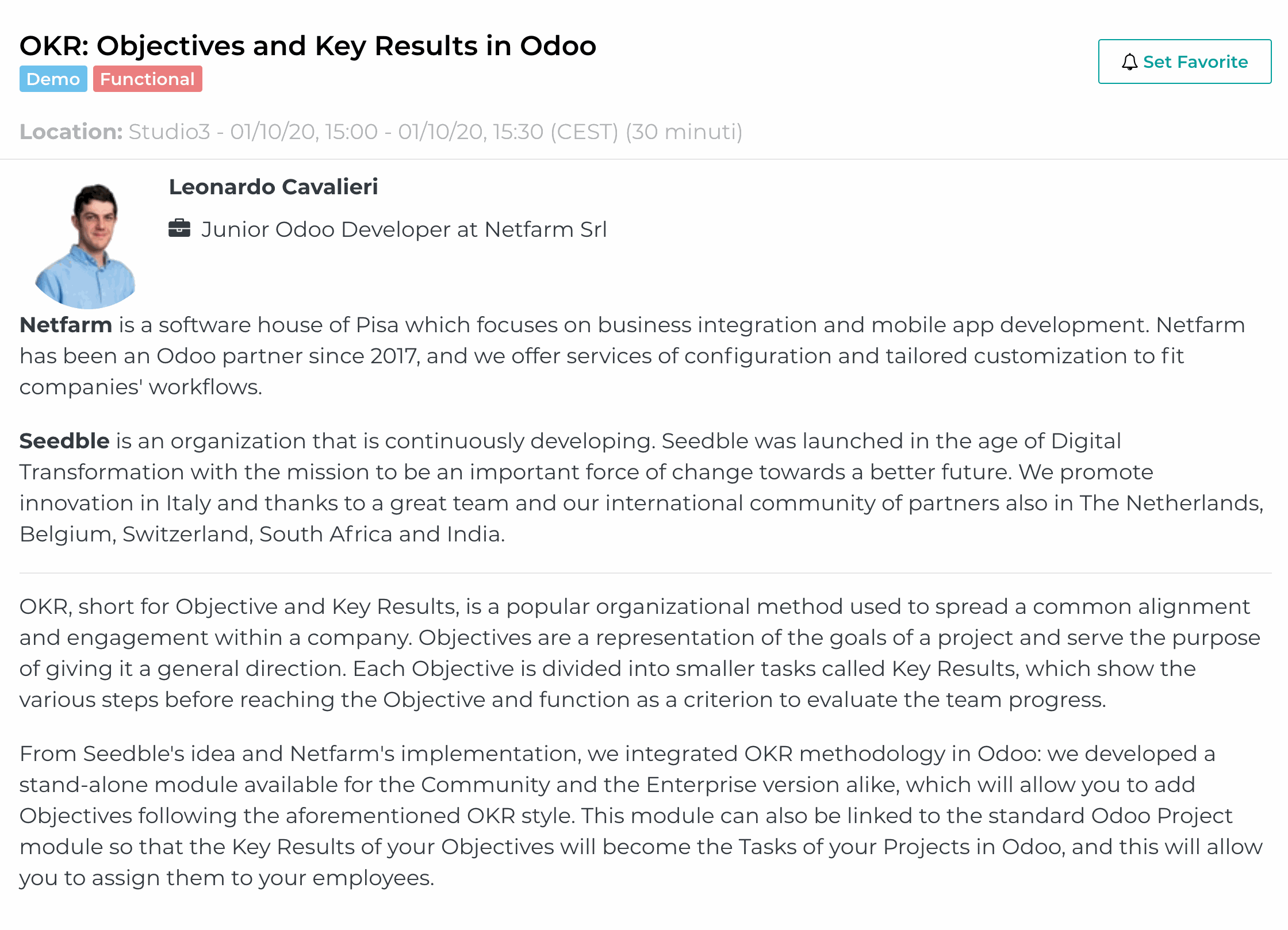 Una breve descrizione del talk disponibile qui: https://www.odoo.com/it_IT/event/odoo-experience-2020-2020-09-30-2020-10-01-2622/track/okr-objectives-and-key-results-in-odoo-2075